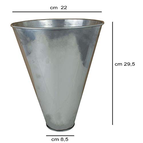 Costruito in lamiera zincata. Altezza cm 29,5 – diametro superiore cm 22 – diametro inferiore cm 8,5 – peso KG 0,7 circa